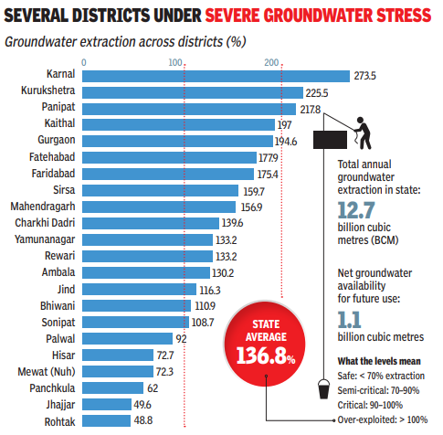 In Haryana, groundwater extraction has reached around 136% of its annual recharge capacity. The state estimates an annual extractable resource of approximately 9.3 lakh ham, while actual extraction is around 12 lakh ham.